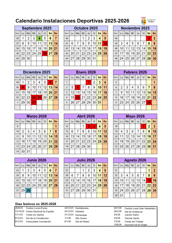 Calendario Temporada 2025/2026 Instalaciones Deportivas